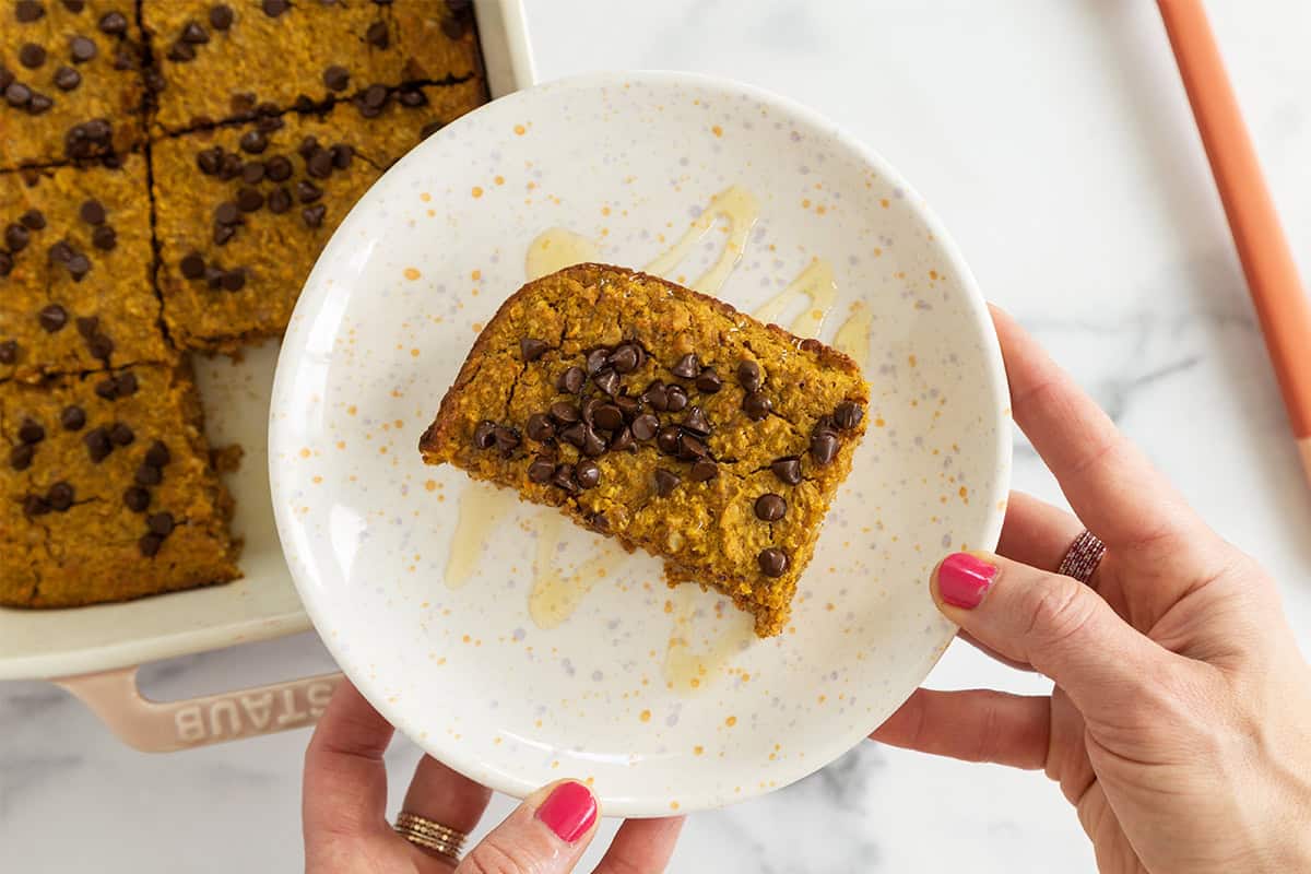 Store the Pumpkin Baked Oatmeal in an airtight container in the fridge for up to 5 days or at room temperature for 3 days.